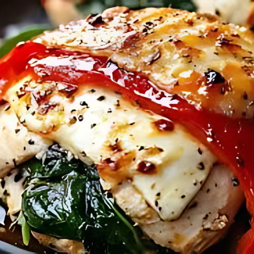 Delicious tender chicken breasts filled with creamy roasted peppers," then oven-baked until perfectly tender, flavorful, and irresistibly delicious.